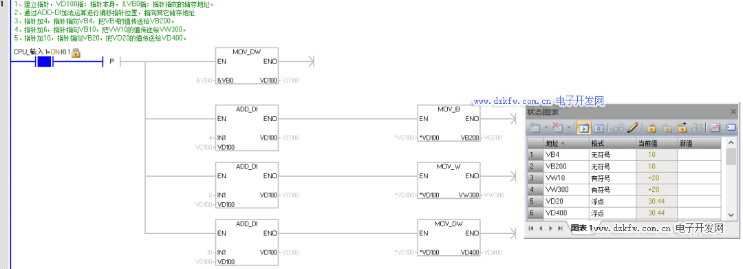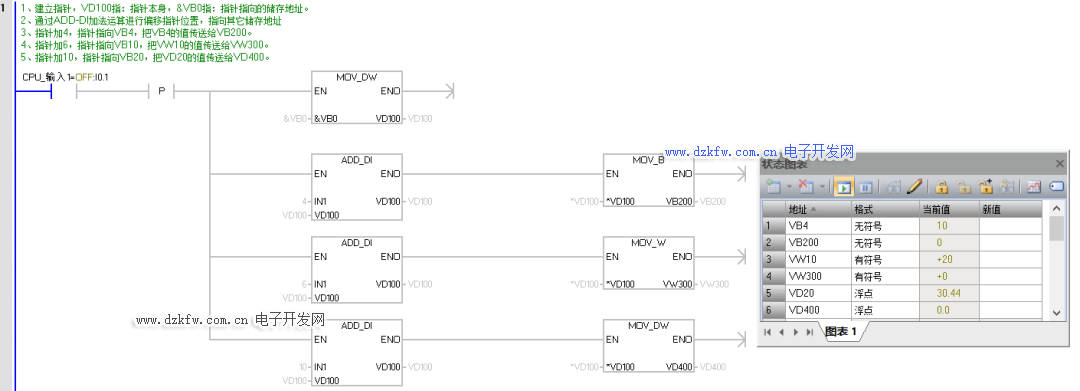 将指针指向的地址存储的数据调取处出来,通过*VD100提取数据(*是取值符),见下图,就是把VB4的值传送给VB200。