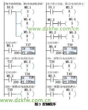 MM420的参数设定好后用PLC的Q0.0~Q1.0输出口分别控制3个变频器的5、6、7端子(如果只用1个或者2个,不用的端子不接即可)。PLC顺序控制的主要程序如图3所示。M0.1控制第一台电动机的运行情况,M0.2控制第二台电动机的运行情况……。当M0.1有输出时,开启第一台变频器,电动机1开始工作;当M0.2有输出时,开启第二台变频器,电动机2开始工作;当M0.3有输出时,开启第三台变频器,电动机3开始工作。反之,当M0.1无输出时,关闭第一台变频器,电动机1停止工作……。
