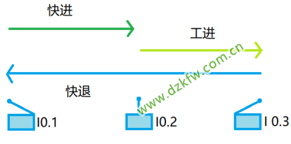 控制要求:某专用冲床动力头的进给运动一个周期包括快进、工进和快退3步,动力头的初始状态停留在最左边,限位开关I0.1状态为1,启动按钮为I0.0,Q0.0~Q0.2控制3个电磁阀依次控制快进、工进和快退3步。