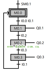 我们以初始状态步M0.0为例,如果步M0.0要实现转换,必须满足两个条件。