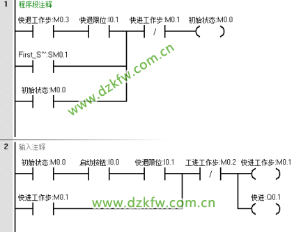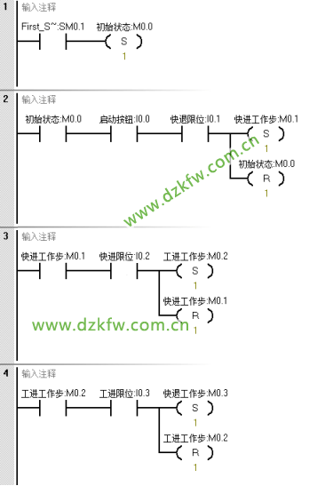 首先M0.0是活动步,所以我们可以用SM0.1置位启动初始状态M0.0,其次是转移条件满足,即按下启动按钮I0.0接通,并且动力头的初始状态停留在最左边即I0.1接通,所以将M0.0和I0.0、I0.1的常开触点串联在一起,当条件都满足时,可以做置位M0.1,转移到M0.1快进工作步,同时把上一个状态M0.0复位掉。其他工作步也是按照同样的方法去做即可。