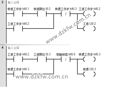 首先根据控制要求画出顺序功能图,M0.0是初始状态,M0.1是快进工作状态步,M0.2是工进工作状态步,M0.3是快退工作状态步。