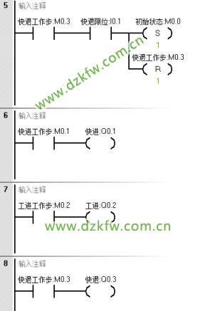 使用逻辑指令实现的顺序功能控制同样也可以利用置位复位指令实现,该方法是以转换条件为中心的编程方法,所谓以转换条件为中心,指的是同一种转换在梯形图中只能出现一次,而对辅助继电器可以重复进行置位和复位。