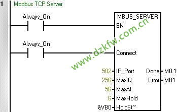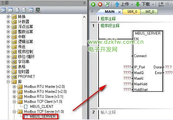 2、鼠标点击 MAIN 主程序的程序段1的编程区域,从库文件夹下找到 Modbus TCP 服务器指令 MBUS_SERVER,鼠标双击,指令出现在程序段1中,操作如图所示。