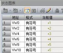 将M0.0置位为1,然后在状态图表中创建变量,VW20-VW30 共6个字,监视值如图7.所示。