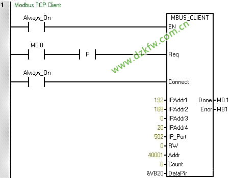 程序执行周期每次扫描都必须调用 MBUS_CLIENT,直到 Done 输出为 TRUE。在每个周期中,MBUS_CLIENT 均会退出,以便程序可以继续运行。客户端完成请求时,MBUS_CLIENT 将 Done 设置为 TRUE。