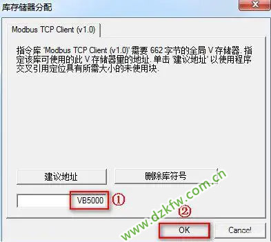 5、在库存储区分配对话框中手动输入存储区的起始地址。此实例为VB5000开始,以使指令库可以正常工作。确保库存储区与程序中其他已使用的地址不冲突。使用建议地址无法确定是否有地址重叠,所以推荐手动输入正确的库存储区首地址。如下图所示。