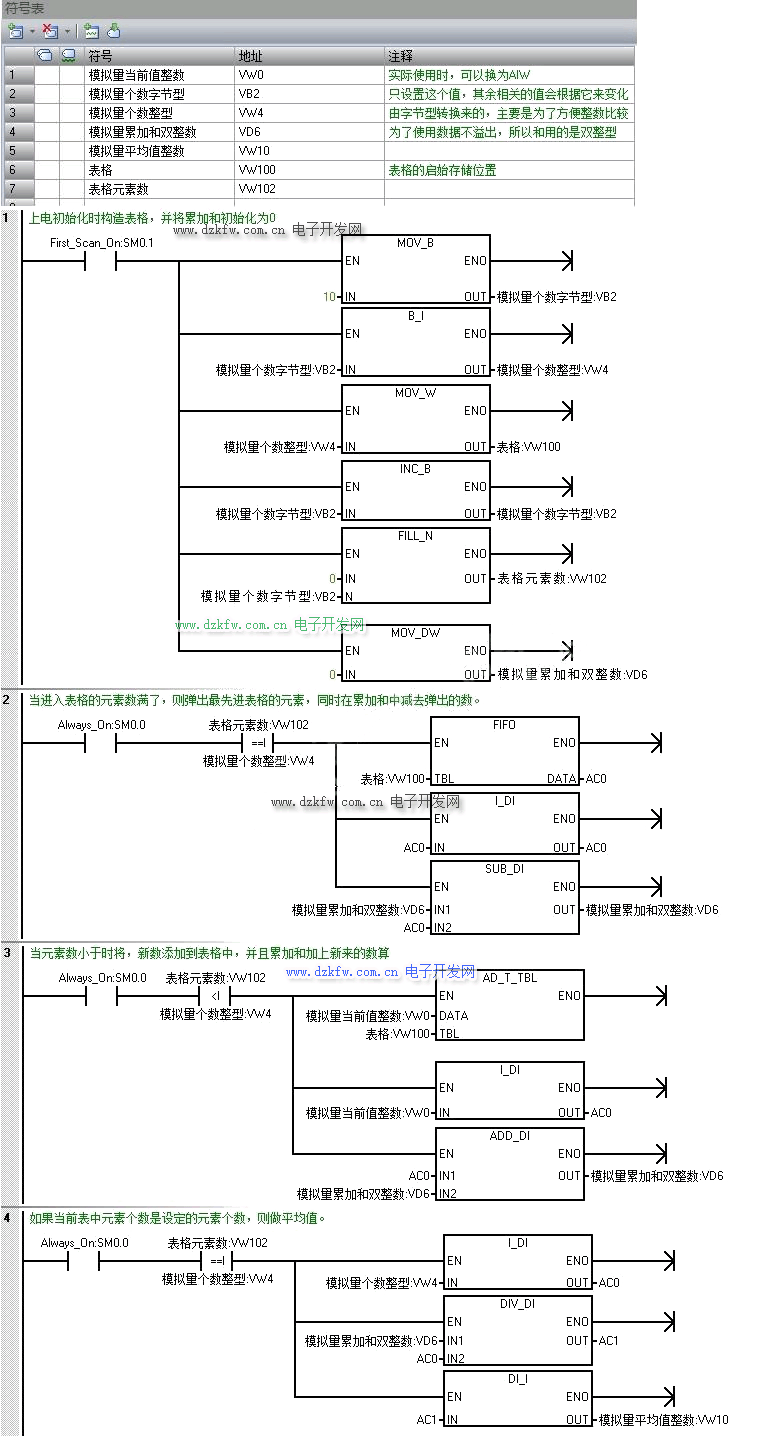 结合变量表,及程序段注释看。如果要改成浮点数,可以些程序基础上改,注意数据类型,以及向表格中增加元素,则将浮点数分成高低字,一次性增加二个字进入表格,同样的道理当弹出时,一次要调用两次 FIFO,并且注意弹出的顺序要进入的顺序相适应。