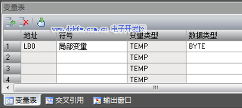 对于主程序与中断程序,局部变量表显示一组已被预先定义为TEMP(临时)变量的行。要向表中增加行,只需用右键单击表中的某一行,选择“插人→行"指令,在所选行的上部插人新的行,选择“插人→行下"指令,在所选行的下部插人新的行。