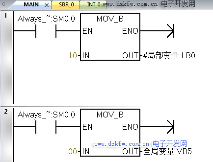 对于子程序,局部变量表显示数据类型被预先定义为IN、IN_OUT.OUT和TEMP的一系列行,不能改变它们的顺序。如果要增加新的局部变量,必须用鼠标右键单击已有的行,并用弹出菜单在所击行的上下插人相同类型的另一局部变量。