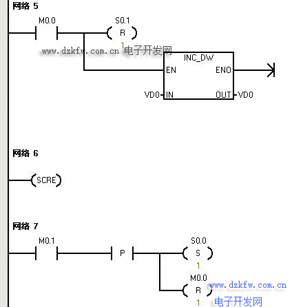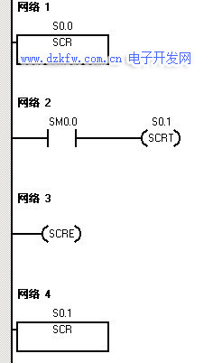 下面就看一下顺序控制指令的使用的程序例子。这里的SCRT指令就是跳转,它是跳到S0.1的,也就是置位S0.1并复位S0.0。