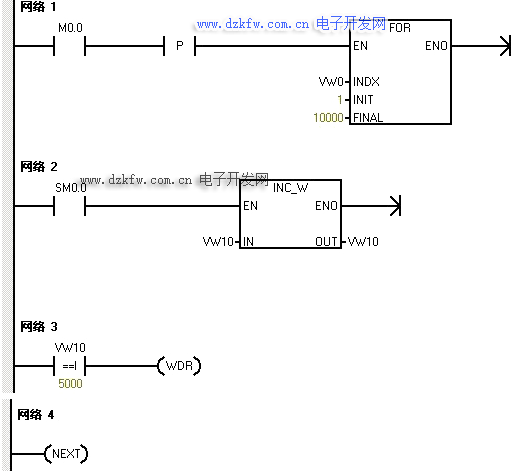 下面再学习一下看门狗复位WDR指令,WDR指令重新触发S7-200 CPU的看门狗定时器,扩展扫描允许使用的时间,而不会出现看门狗错误。我们在使用看门狗复位指令时应当小心,如果使用循环指令阻止扫描完成,那么像I/O更新、通讯等程序只有在扫描周期完成后才能执行。如果对程序预计扫描时间将超过500毫秒,可能阻止返回主扫描超过500毫秒,这时就应当使用WDR指令,重新触发看门狗定时器。以下程序就是使用了看门狗复位的例子。