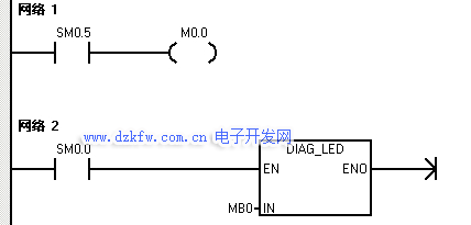 最后再看一下诊断LED灯DIAG_LED指令,该指令中如果输入参数IN的数值为零,则诊断LED会被设置为不发光。如果输入参数IN的数值大于零,则诊断LED会被设置为发光 (黄色)。下面的程序让诊断LED灯亮0.5s,灭0.5s,那么当输入IN的数值大于零时,诊断LED会被设置为发光(黄色)。