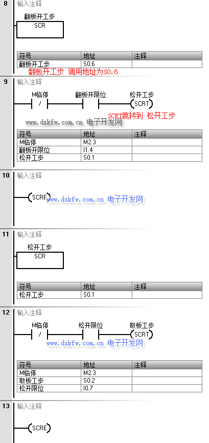 SCRE:顺序控制继电器结束指令,使程序退出当前正在执行的SCR段,表示一个SCR段的结束。每个SCR段必须由SCRE指令结束。