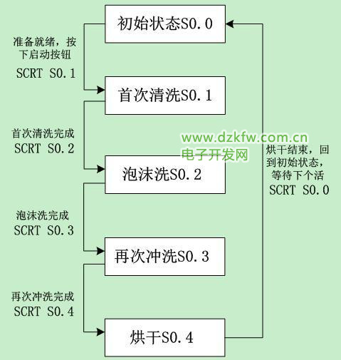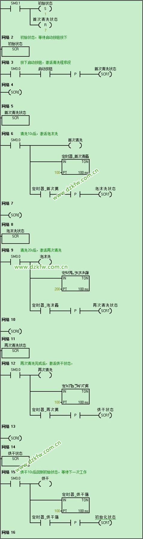 例如:一台洗车机工作过程首次清洗,泡沫洗,再次冲洗和烘干。因此需要使用五个顺序继电器,分别是:初始等待,首次清洗,泡沫洗、再次冲洗,烘干。