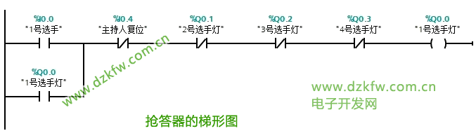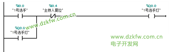 如图,只有当2号选手、3号选手、4号选手都没有抢答的时候,1号选手才能点亮自己的灯;如果有一个人抢答,例如4号选手,那么当4号选手灯点亮后,其常闭触点断开,能流永远无法通过,直至主持人开启新一轮抢答。其他只有当2号选手、3号选手、4号选手可以参考1号选手的梯形图程序进行编写,就可以得出一个四路抢答器的梯形图程序。