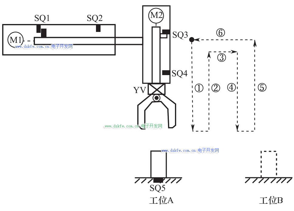 ②机械手的初始状态(原点条件)是机械手应停在工位A的上方,SQI、SQ3均闭合。