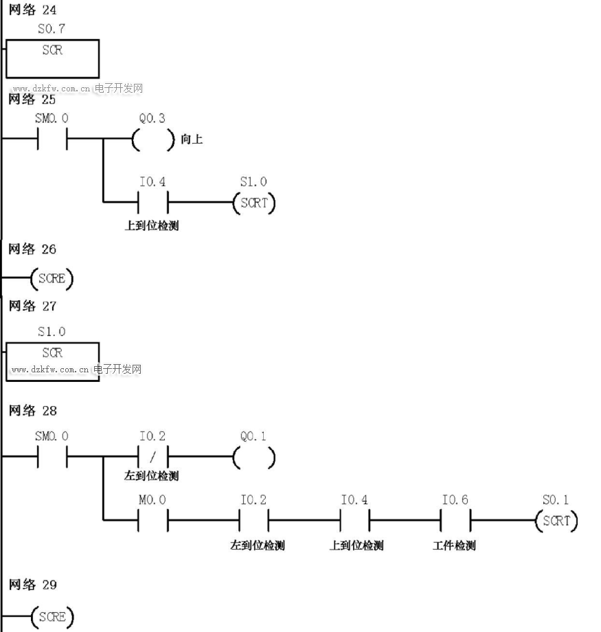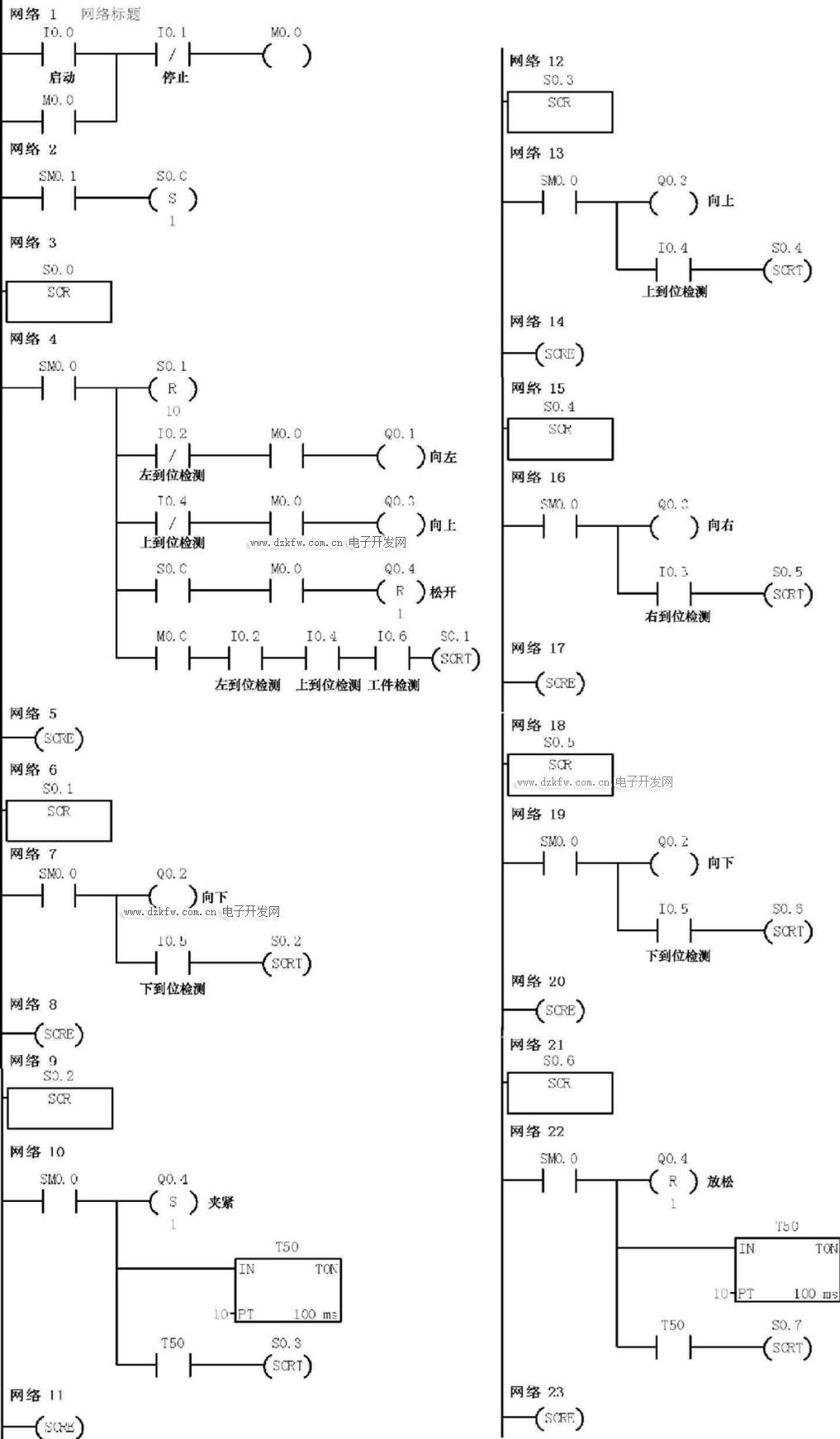 [4]为原点检测程序,当按下启动按钮SB1时→[1]I0.0常开触点闭合,辅助继电器M0S1.0.0线圈Q得0.1电,机械M手0左.0移自锁触点闭合,锁定供电,同时[4]M0.0常开触点闭合,因S0.0状态I0器.4机被械手置上位升,到位故S0.0常开触点闭合,Q0.4线圈复位,接触器KM5线圈失电,机械手夹紧线I0.圈6工失作台电A而上有放工松件,[4]中的其他M0.0常开触点也均闭合。若机械手未左到位,开关SQ1断开,[4]I0.2常闭触点闭合,Q0.1线圈得电,接触器KM1线圈得电,通过电动机M1驱动机械手左移,左移到位后SQ1闭合,[4]I0.2常闭触点断开;若机械手未上到位,开关SQ3断开,[4]I0.4常闭触点闭合,Q0.3线圈得电,接触器KM4线圈得电,通过电动机M2驱动机械手上升,上升到位后SQ3闭合,[4]I0.4常闭触点断开。如果机械手左到位、上到位且工位A有工件(开关SQ5闭合),则[4]I0.2、I0.4、I0.6常开触点均闭合,执行“SCRT S0.1”指令,使S0.1程序段成为活动步程序,程序转移至S0.1程序段,开始控制机械手搬运工件。
