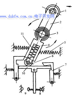 1-滚轮 2-上转臂3、5、11-弹簧4-套架 6-滑轮 7-压板 8、9-触点 10-横板