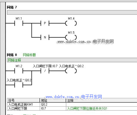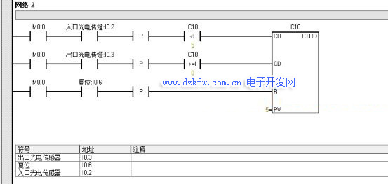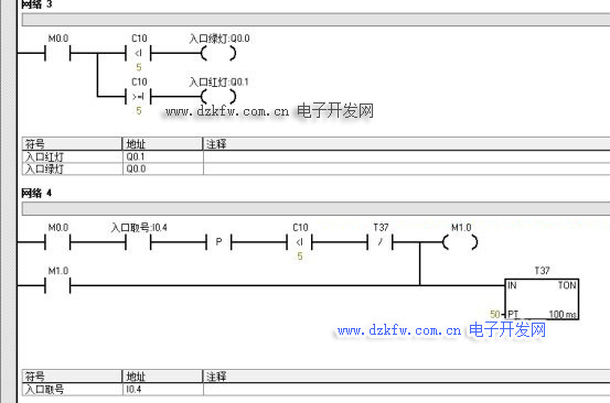 (2)入库车辆前进时,经过入口光电传感器,此时车位尚未满的话,入口光电传感器将信号送给电动机控制电动机正转,栅栏向上打开,当达到上限位置时,栅栏打开停止,同时定时器T38开始定时5秒,定时器T38定时到将T38信号送给电动机控制电动机反转,栅栏向下关闭,当达到下限位置时,栅栏门停止动作;另外,入口光电传感器将信号送给加减计数器C10,加减计数器C10加1,并将加减计数器C10的差值信号实时传给七段数码显示屏;