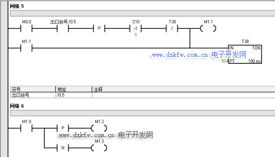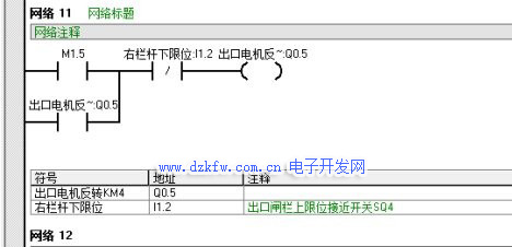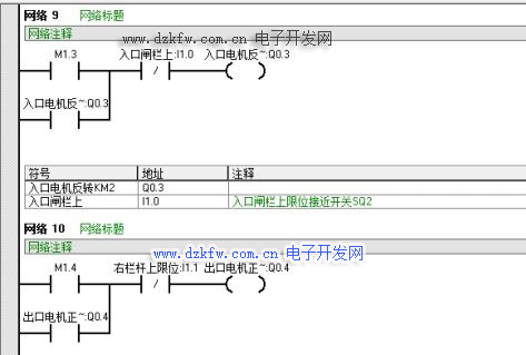 (3)出库时,经过出口光电传感器,出口光电传感器将信号送给电动机控制电动机正转,栅栏门向上打开,当达到上限的时候,栅栏停止打开,同时定时器T39开始定时计时5秒,定时器T39定时到将T39信号送给电动机控制电动机反转,栅栏向下关闭,当达到下限位时,栅栏门停止动作;另外,出口光电传感器将信号送给加减计数器C10,加减计数器C10加1,并将加减计数器C10信号实时传给七段数码显示屏;
