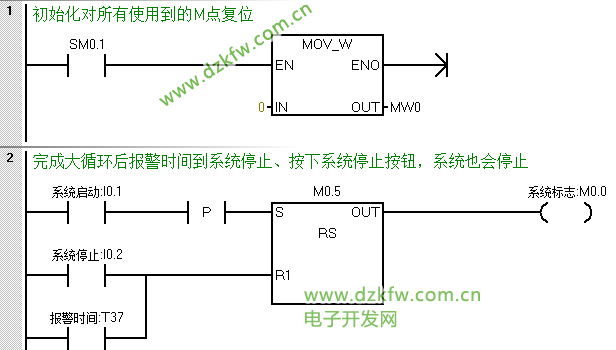 根据控制要求首先我们应该列出控制系统的IO分配表,这块在这不做过多的介绍,直接讲大家关心的程序设计部分,先是要有系统标志位,并在任何时候按下停止及工作完成后系统均要停止,所以我们可以编写一段起保停的程序(也可使用复位优先指令)。