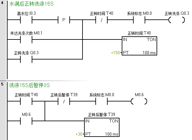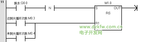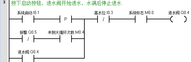 第二步:按下启动后进水阀需要进水,在达到高水位后,停止进水;并且根据第六点控制要求,在未达到大循环次数时也需要进水,梯形图程序如下: