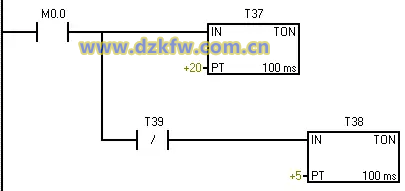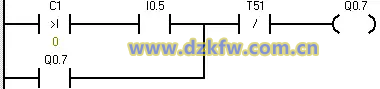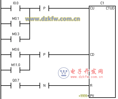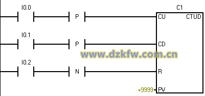 在此程序功能块的输入端“CU”处每输入一个脉冲信号,对计数器加1;输入端“CD”处每输入一个脉冲信号,即对计数器加1;输入端“R”处每输入一个脉冲信号,即对计数器清零。
