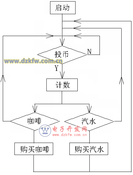 3. 售货机内的二种饮料有相对应价格,当投入的货币大于等于其售价时,对应的汽水指示灯C、咖啡指示灯D点亮,表示可以购买。