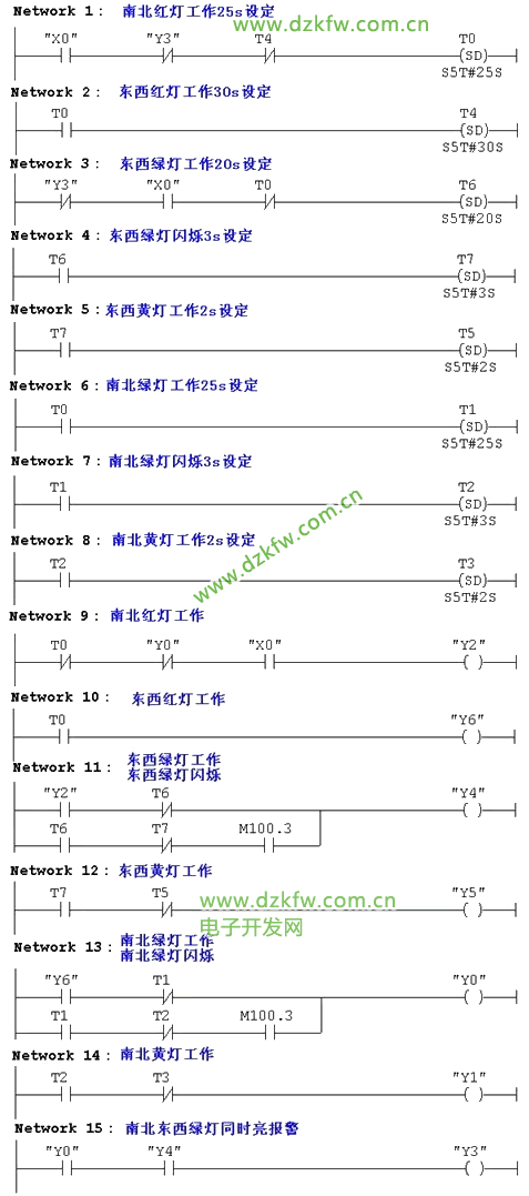 一个红绿灯的PLC梯形图,简单实现红灯亮10秒然后灭,绿灯灯亮15秒灭后,黄灯灯亮3秒然后到红灯,如此循环!!