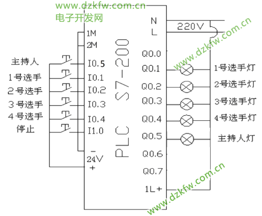 控制任务:有4个抢答席和1个主持席,每个抢答席席上各有1个抢答按钮和1个抢答指示灯。参赛者在允许抢答时,第一个按下抢答按钮的抢答席上的指示灯将会亮,且释放抢答按钮后,指示灯仍然亮;此后另外两个抢答席上即使在按各自的抢答按钮,其指示灯也不会亮。这样主持人就可以轻易的知道谁是第一个按下抢答器的。该题抢答倒计时结束后,指示灯熄灭,又可以进行下一题的抢答比赛。