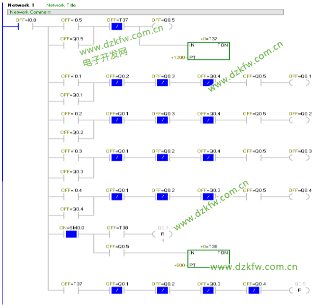 控制软件应用SIEMENS编程软件,采用梯形图语言编写,根据系统控制要求,进行针对性设计,要充分保证系统的安全,保证整个系统的运行安全可靠。自动条件下,必须复位后在满足自动条件下才能进行自动运行程序,当中充分应用各个过程的互锁来保证系统的安全。
