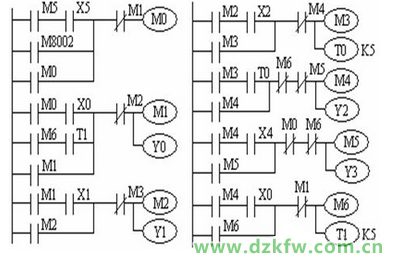 人靠近自动门时,感应器X0为ON,Y0驱动电动机高速开门,碰到开门减速开关X1时,变为低速开门。碰到开门极限开关X2时电动机停转,开始延时。若在0.5s内感应器检测到无人,Y2起动电动机高速关门。碰到关门减速开关X4时,改为低速关门,碰到关门极限开关X5时电动机停转。在关门期间若感应器检测到有人,停止关门,T1延时0.5s后自动转换为高速开门。