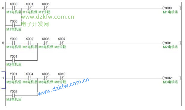 按下X000后,Y000得电并自锁,电机M1开始运行;然后再按下X002,Y001得电并自锁,电机M2开始运行;再按下X004,Y002得电并自锁,电机M3开始运行,符合上述需求中3台电动机必须按照M1、M2、M3的固定顺序启动。