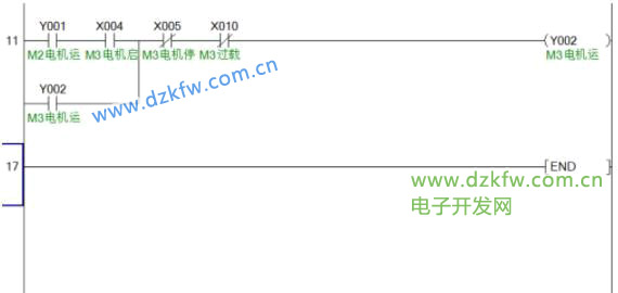 在需求中提到停止不做要求,因此三台电动机只要按下各自的停止按钮就能停止。当按下X001,Y000断电,电机M1停止;按下X003,Y001断电,电机M2停止;按下X005,Y002断电,电机M3停止。在电机过载时,过载的电机就会停止运行。