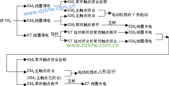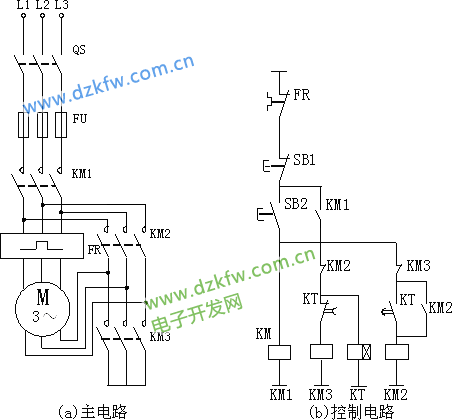 它是根据起动过程中的时间变化,利用时间继电器来控制 Y/ △的换接的。由( a)图知,工作时,首先合上刀开关QS,当接触器KM 1 及KM 3 接通时,电动机Y形起动。当接触器KM 1 及KM 2 接通时,电动机△形运行。图(b)为控制电路,其工作过程分析如下: