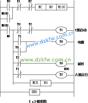 工作过程分析如下:按下启动按钮 SB 2 时,输入继电器X0的常开触点闭合,并通过主控触点(M100常开触点)自锁,输出继电器Y1接通,接触器KM 3 得电吸合,接着Y0接通,接触器KM1得电吸合,电动机在Y形接线方式下起动;同时定时器T 0 开始计时,延时8秒后T 0 动作,使Y1断开,Y1断开后,KM 3 失电,互锁解除,使输出继电器Y2接通,接触器KM2得电,电动机在△形接线方式下运行。