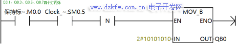 QB0被传送至二进制1010 1010后其中Q0.1、Q0.3、Q0.5、Q0.7四个灯闪烁)