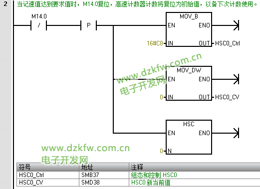 上述程序注解:当记速值达到要求值时,M14.0复位,高速计数器计数将复位为初始值,以备下次计数使用。