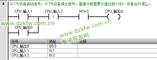 上述程序注解:I0.1为设备启动信号;I0.1为设备停止信号。高速计数器累计值达到13 时,设备运行停止。