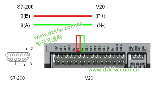 本示例根据操作手册中的串口引脚说明3#引脚为RS485信号正,8#引脚为RS485信号负;用电缆将S7-200 SMART 自带的串口与V20的RS485接口相连(注意端口连接规则:V20的P+对3、N-对8),如下图所示: