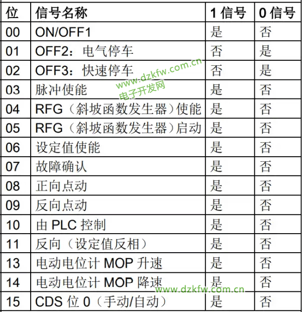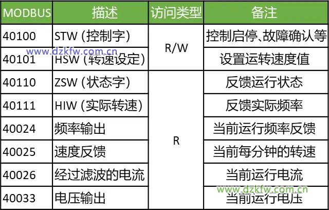 下表显示了 SINAMICS V20 变频器支持的部分寄存器。“访问类型”一列中的“R”“W”“R/W”分别代表读、写、读/写。HSW(转速设定值)HIW(实际转速)STW(控制字)ZSW(状态字)为控制数据。