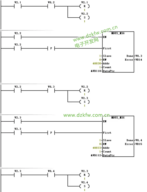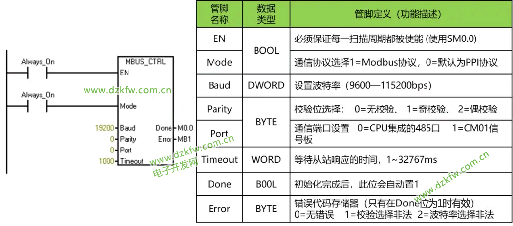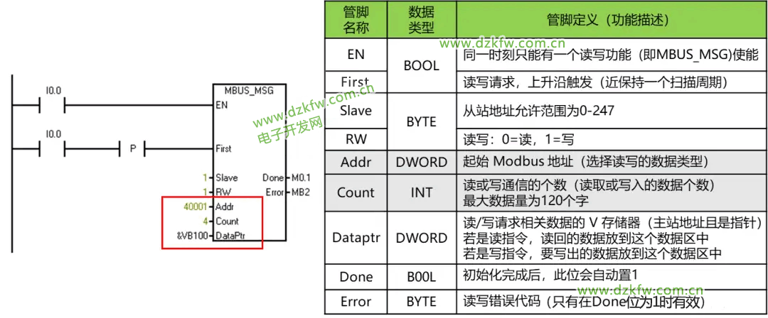 要实现本示例的控制要求,必须使用以下两条通信指令,一条是通信初始化指令,另一条为通信数据读写指令,具体指令介绍如下: