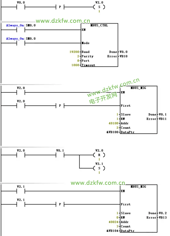 02示例应用下面通过一个案例充分理解MODBUS的应用,具体控制要求是西门子200SMART和西门子V20变频器通过MODBUS通信功能实现变频器正转,反转,停止和点动,并实现读取运行状态和电压电流等信息。