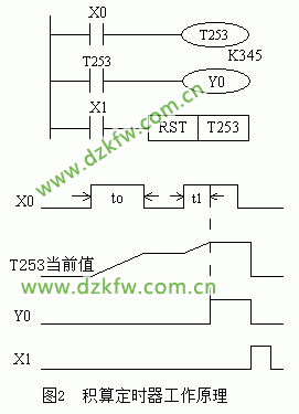 如图2所示,当X0接通时,T253当前值计数数器开始累积100ms的时钟脉冲的个数。当X0经t0后断开,而T253尚未计数到设定值K345,其计数的当前值保留。当X0再次接通,T253从保留的当前值开始继续累积,经过t1时间,当前值达到K345时,定时器的触点动作。累积的时间为t0+t1=0.1×345=34.5s。当复位输入X1接通时,定时器才复位,当前值变为0,触点也跟随复位。