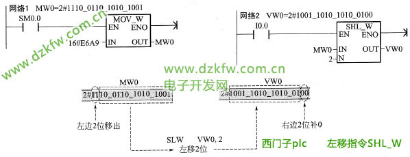 (1)左移指令SHL_W 对于左移指令.按指定位数(N)对源操作数(IN)依次左移N位,左边移出位自然丢失,右边空缺应补0,并将移位结果保存在目的操作数(OUT)中,源操作数(IN)保持不变。应用示例如图3-4所示。