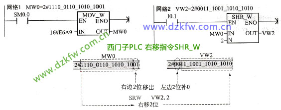 (2)右移指令SHR_W 对于右移指令,按指定位数(N)对源操作数(IN)依次右移N位,右边移出位自然丢失,左边空缺位补0,并将移位结果保存在目的操作数(OUT)中,源操作数(IN)保持不变。应用示例如图3-5所示。