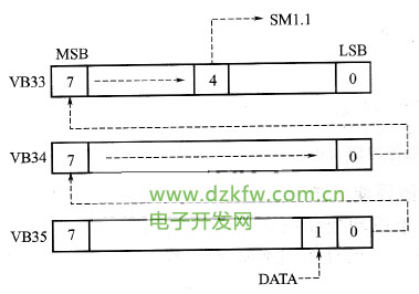 图3-8 移位寄存器指令应用示例 移位寄存器指令的应用示例如图3-8所示。 在“移位减”(N为负值)中,输入数据(DATA)移入移位寄存器的最高位,并移出最低位(S_BIT)。移出的数据被放置在SM1. 1中。移位原理如图3-9所示。