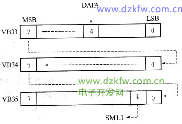 图3-10 “移位加”的移位原理 在“移位加”(N为正值)中,输入数据(DATA)移入移位寄存器的最低位(由S-BIT指定),并移出移位寄存器的最高位。移出的数据被放置在SM1.1中。移位原理如图3-10所示。