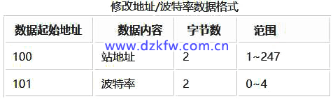 支持Modbus功能码0x10或者0x06修改传感器的站地址或者波特率,数据格式如下表所示: